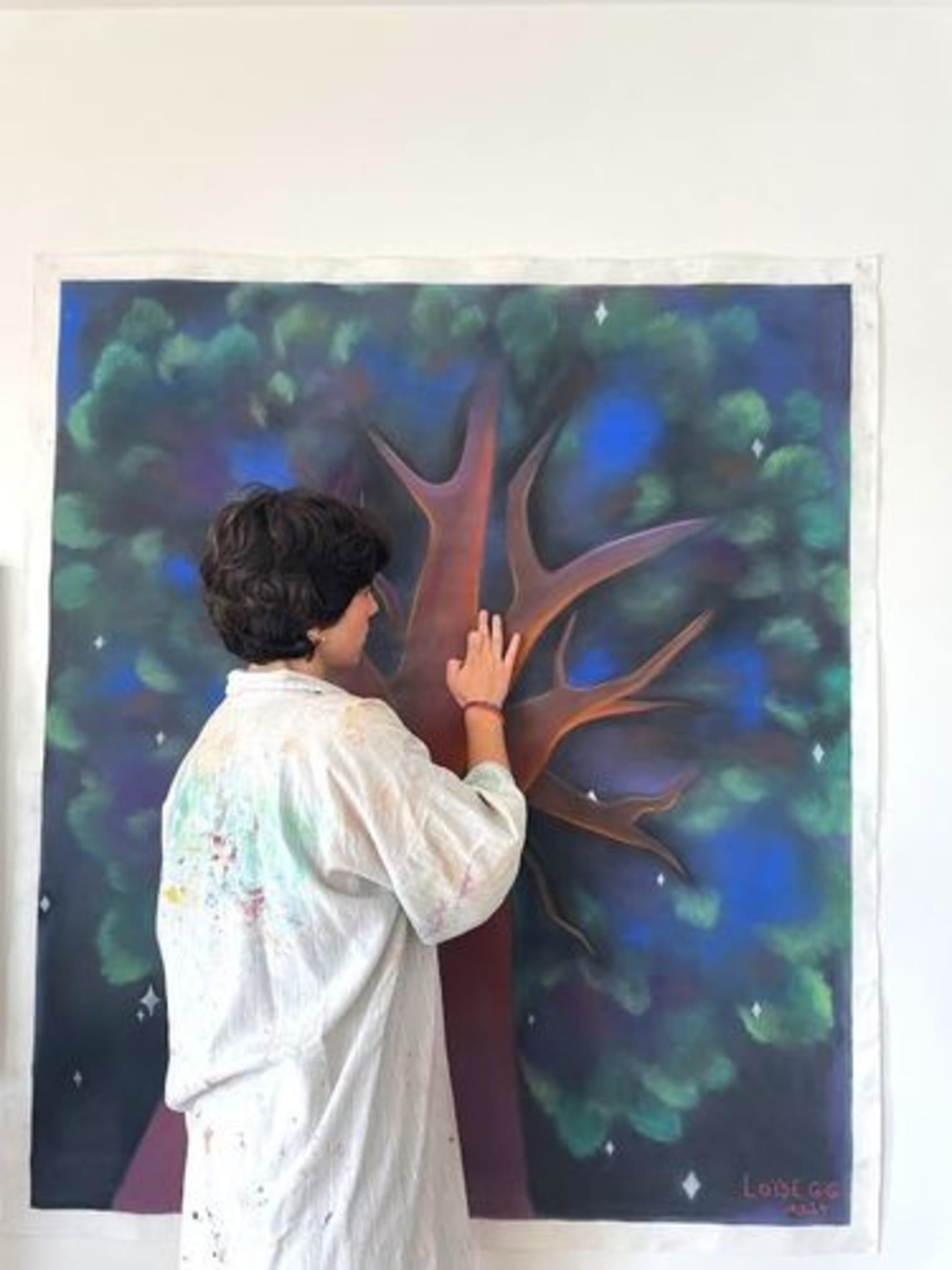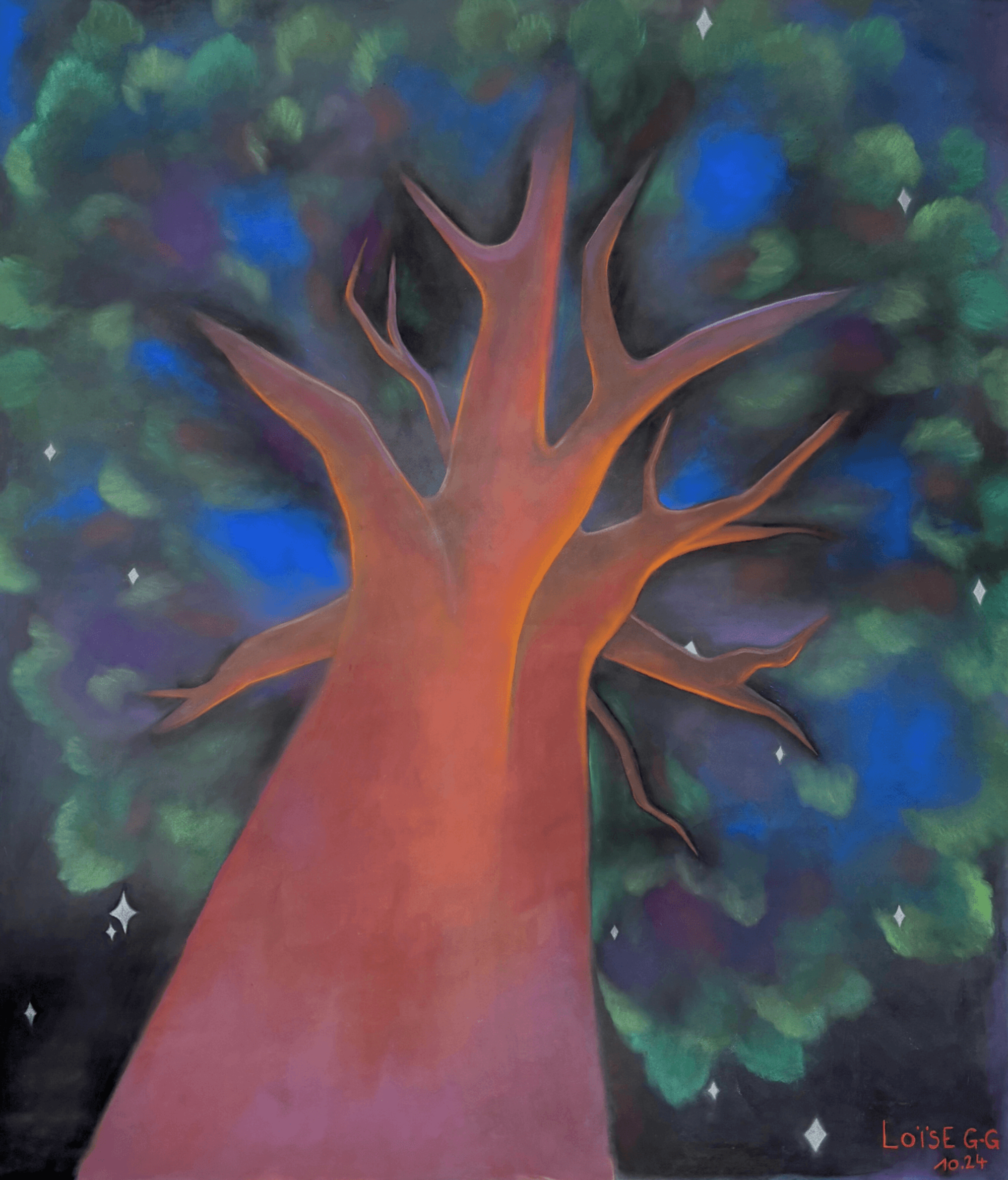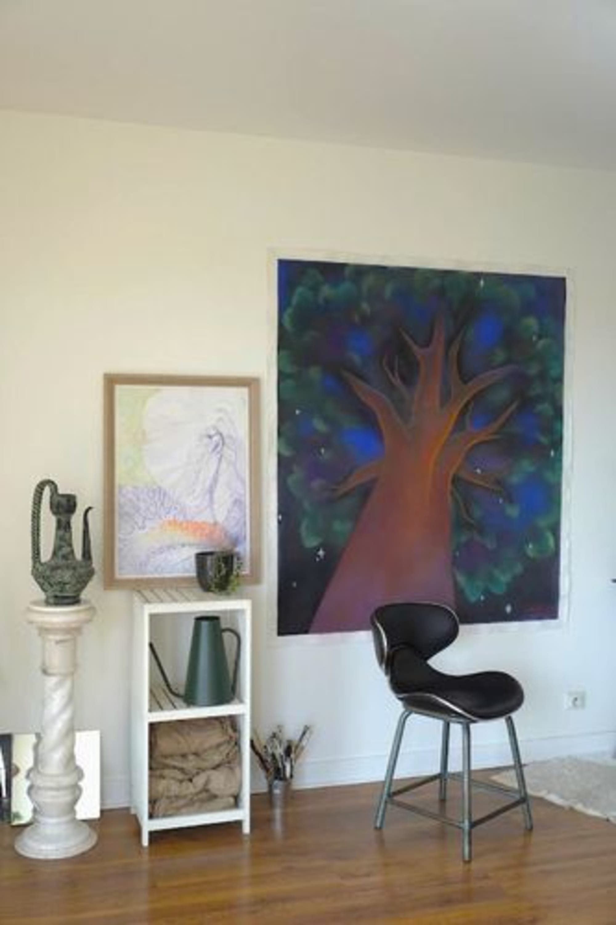 Pour celles et ceux qui grandissent dans l’art de la lenteur et du silence, qui ont en elles.eux la puissance des grands arbres. Ce tableau donne à la pièce une atmosphère méditative et intime, tournée vers le cheminement intérieur, profond et spirituel. Il rappelle la puissance de vivre et de faire quelque chose de plus grand que soi.