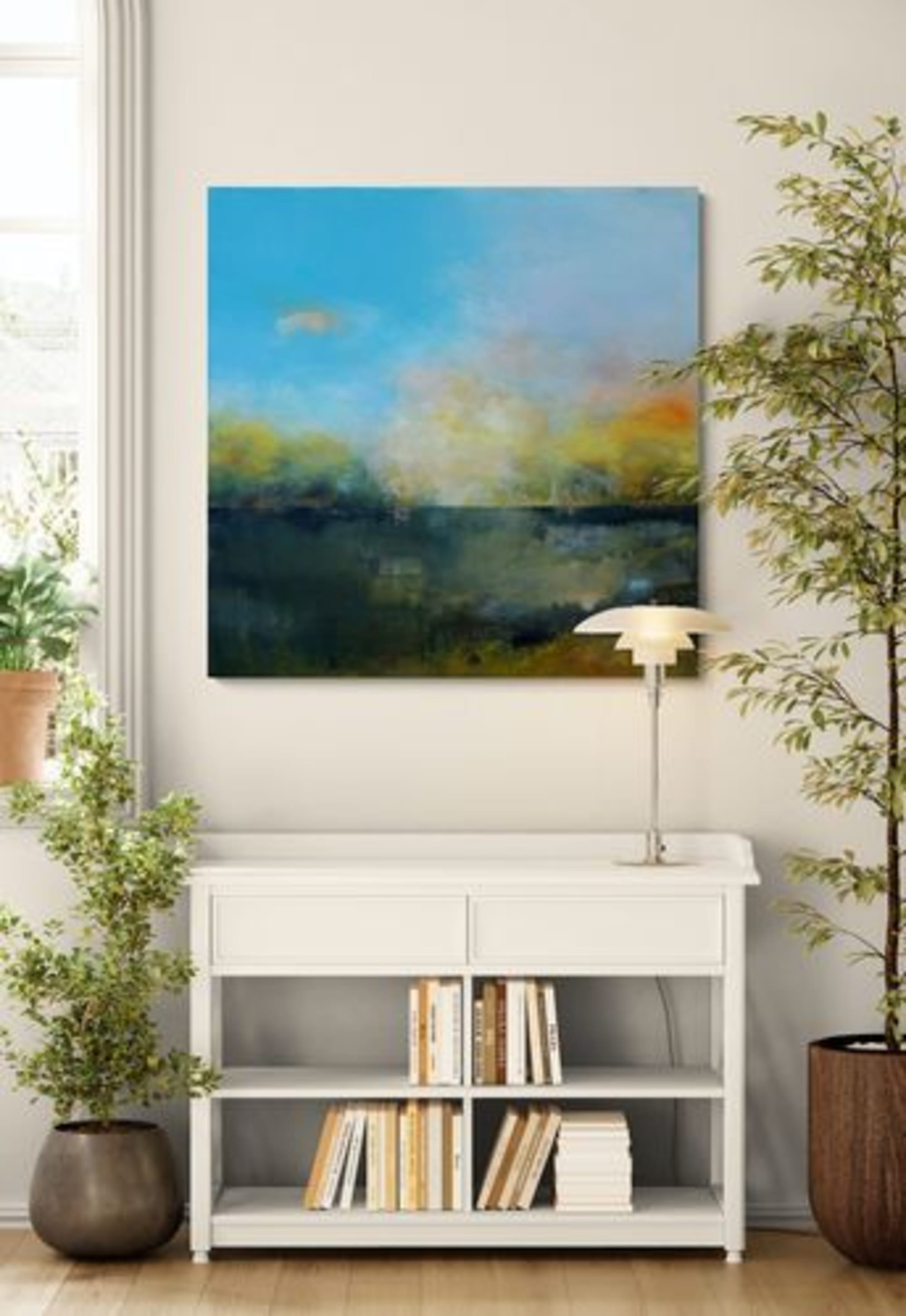 Sur cette toile réalisée en technique mixte, une ligne d’horizon sombre structure la composition et fait scintiller la clarté du ciel bleu, nuancé de brumes dorées et de vapeurs orangées. Les glacis, superpositions de matières et légers effets de transparence suggèrent une plaine noyée de lumière, entre brouillard du matin et fin de jour incandescente.