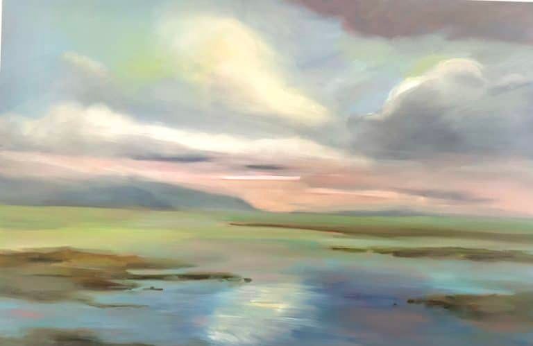 Peinture à l’huile sur toile. Encadrement type caisse américaine en bois clair.