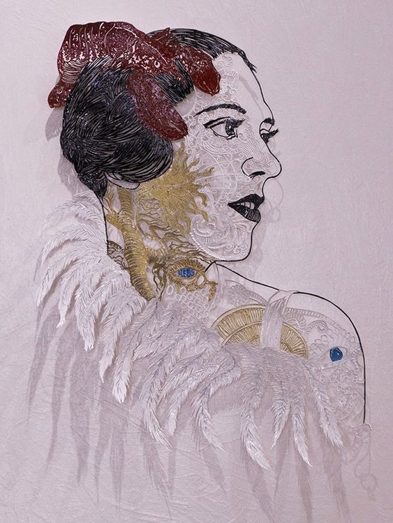 Peinture acrylique et résine sur dentelle de papier découpé au scalpel.