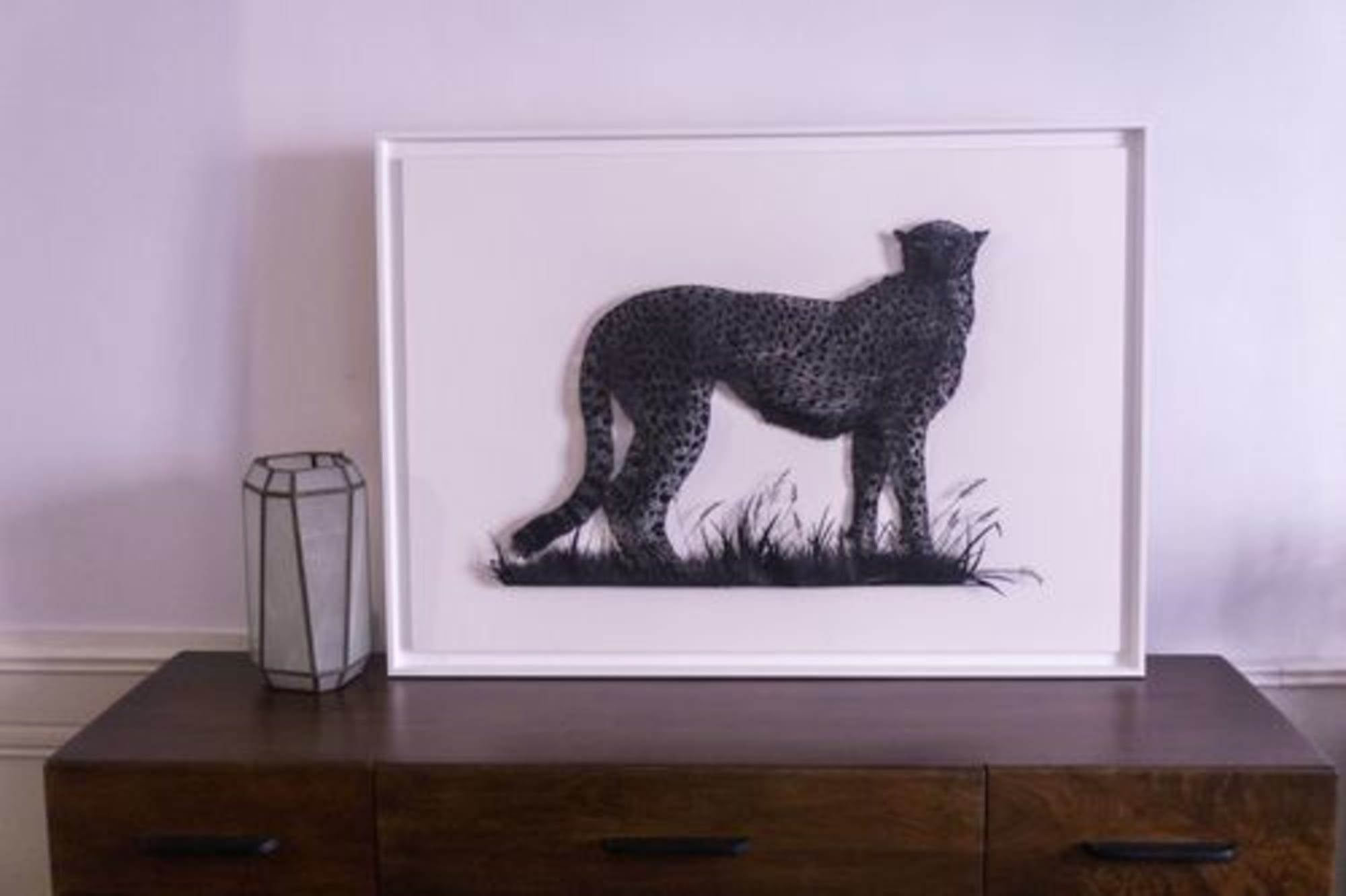 Le découpage est clouté sur une planche en bois de couleur blanche. L’encadrement est dans une caisse américaine blanche.