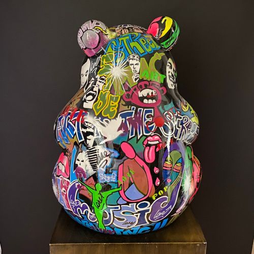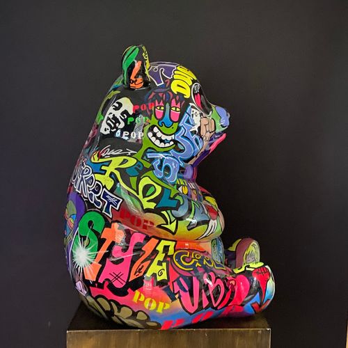 Grand Panda en fibre de verre tagué acrylique et vernis glacé Thème collection Crazy Animals mélangeant Street Art et Pop Art, énergie et humour.