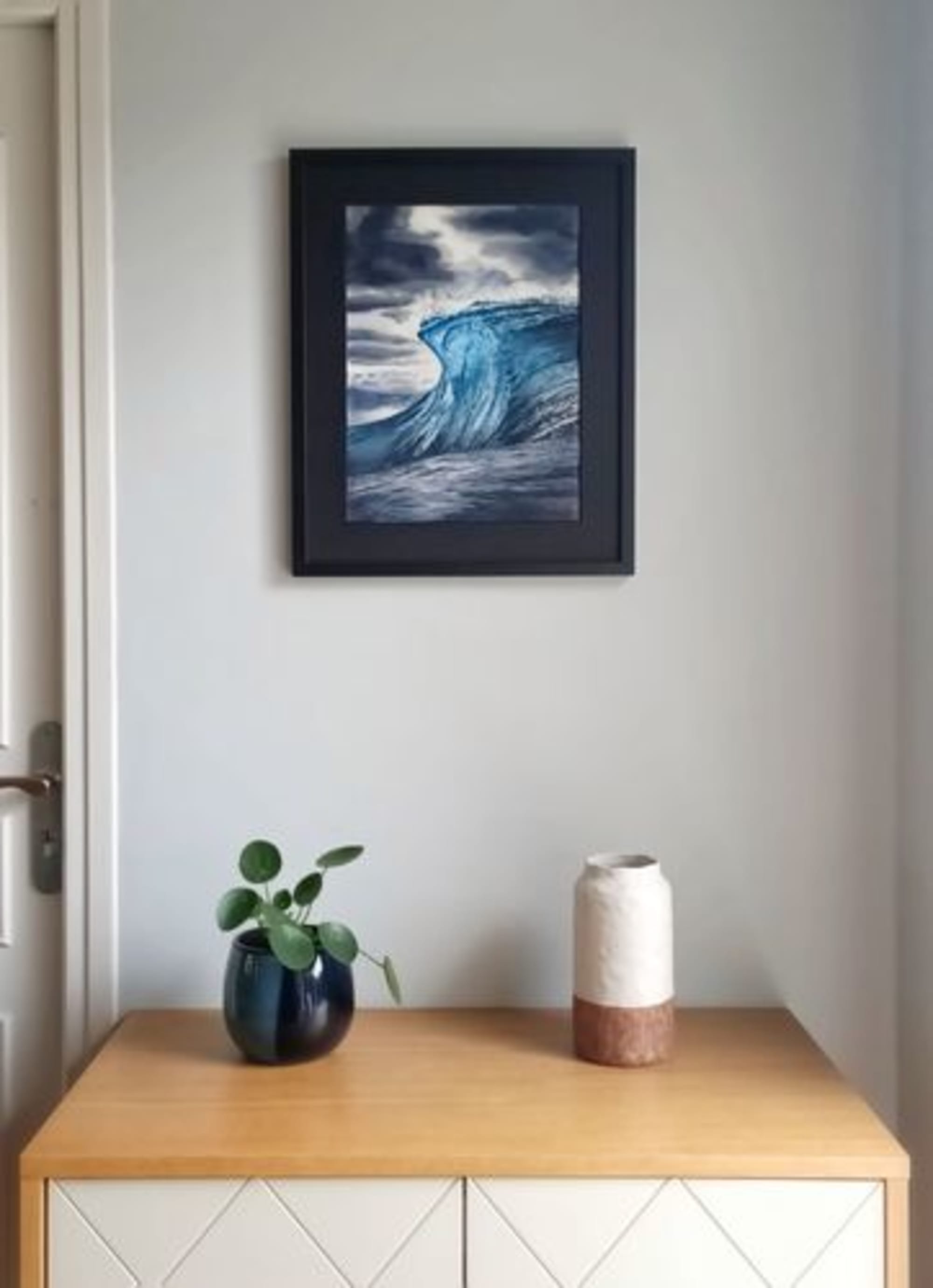 Encadrée dans un cadre bois massif noir satiné 40x50cm, avec passe-partout noir.