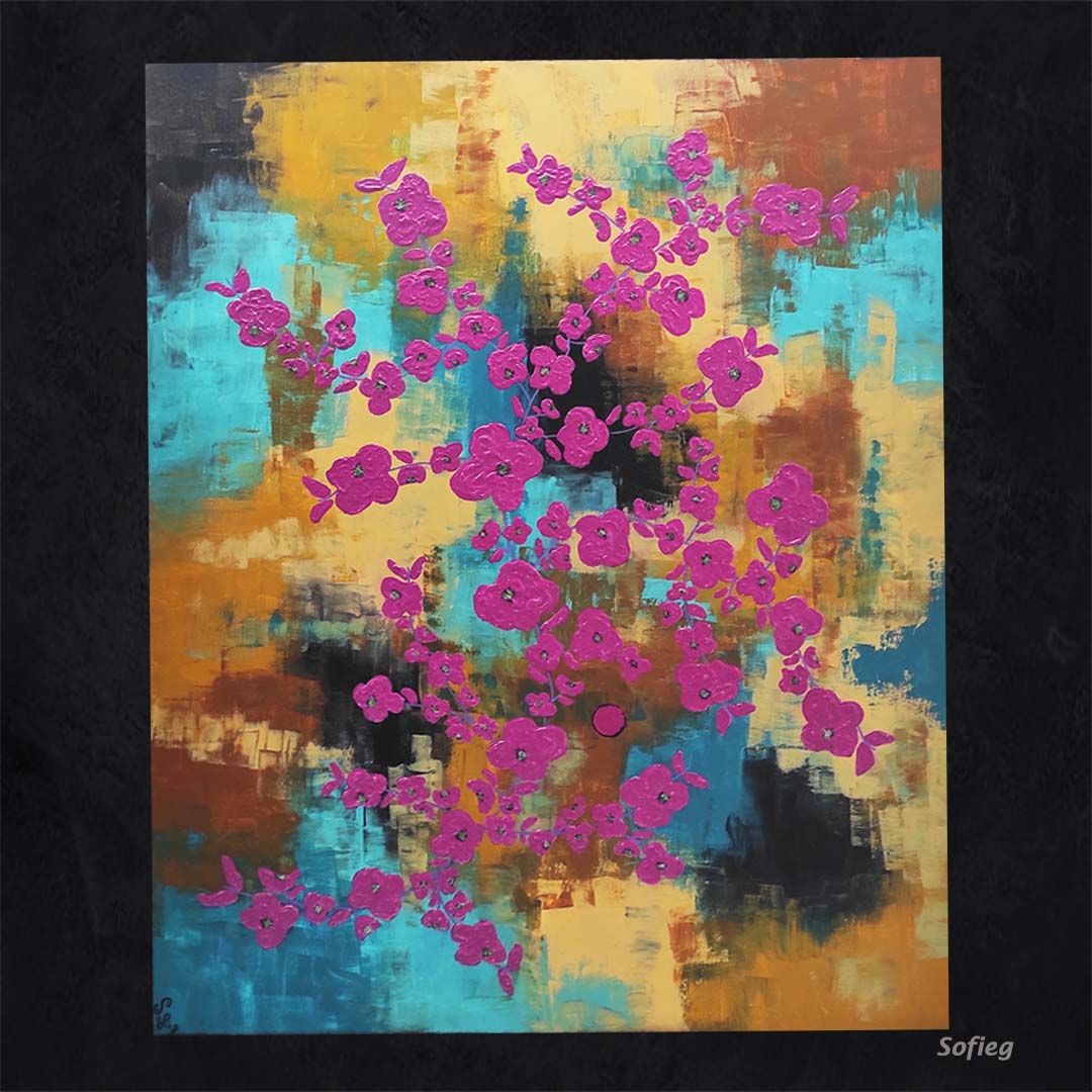 PRÉCIEUSE ,florale de couleur violette pour conter fleurette …… Œuvre originale et unique peinte à la main par Sofieg : Peinture acrylique en relief, sur toile , avec plâtre…. Avec 3 couches de vernis pour ne pas prendre une ride … Les bords sont peints, ne nécessite pas un encadrement et un système d’accrochage est mis au dos de l’œuvre, pour ne mettre qu’un clou au mur. Peut se mettre à l ‘horizontal ou vertical. La toile est signée et contresignée au dos, livrée avec son certificat d’authenticité.