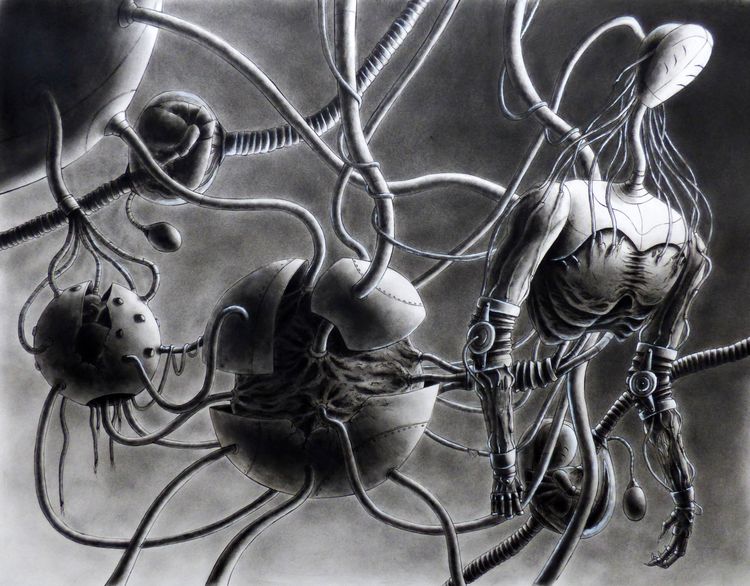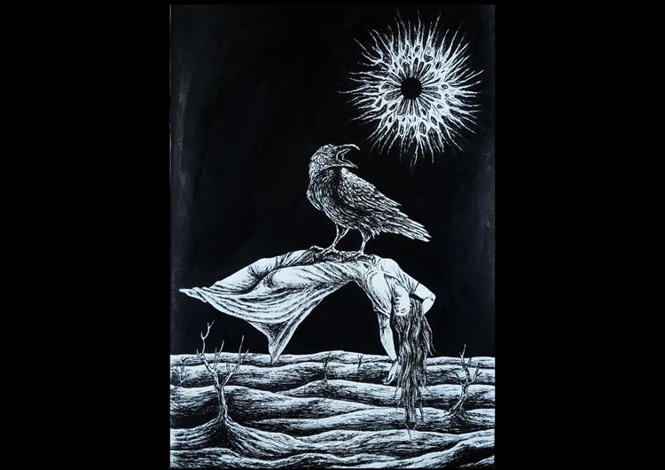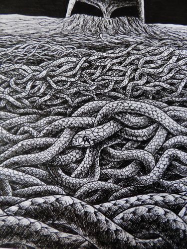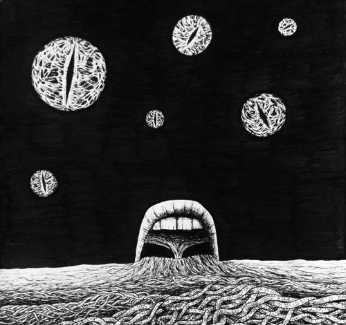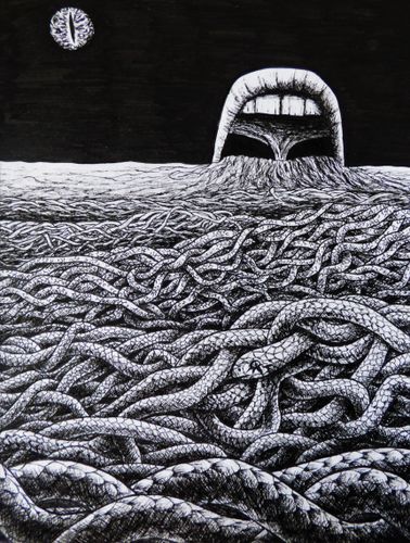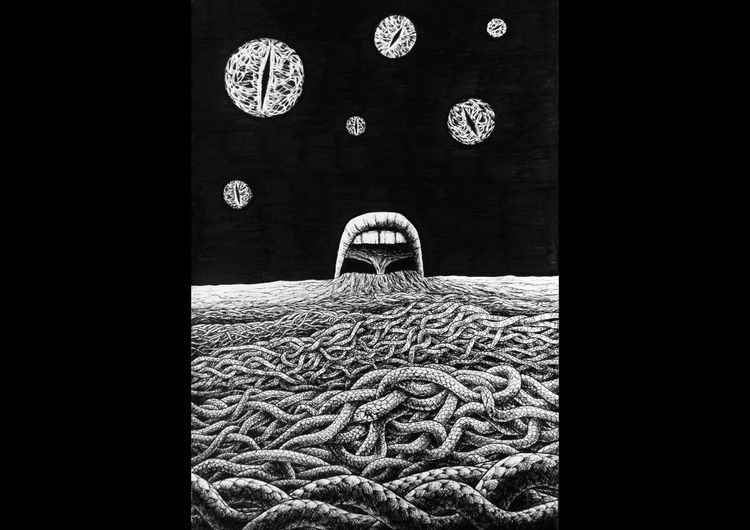 Il s’agit d’un dessin réalisé pour illustrer le poème “Après” de René Daumal, à l’encre de Chine et feutres à encre sur papier. En m’inspirant des œuvres surréalistes, j’ai cherché à illustrer ce poème de manière très symbolique, en représentant un paysage intérieur très tourmenté, composé d’une mer de serpents (ou d’un seul serpent ?) sortant d’une bouche isolée, et dont les seules étoiles sont des yeux de reptiles. Tous les détails et ombres sont créés par une accumulation de traits.